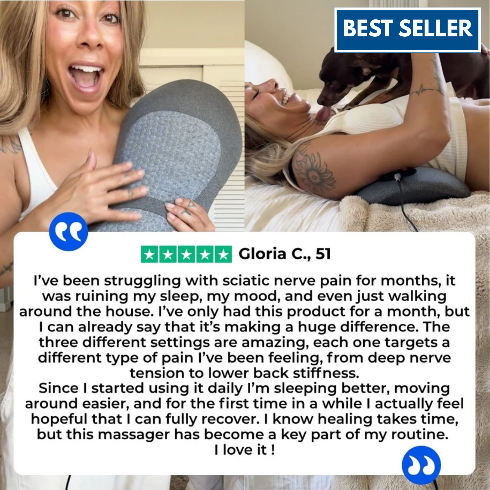 “I’ve dealt with lower back pain for years and honestly tried everything. I didn’t expect much, but after the first few uses I already felt a difference. The pressure on my leg eased up and I could finally sit without constantly shifting around. It just feels like my back can relax again.”
